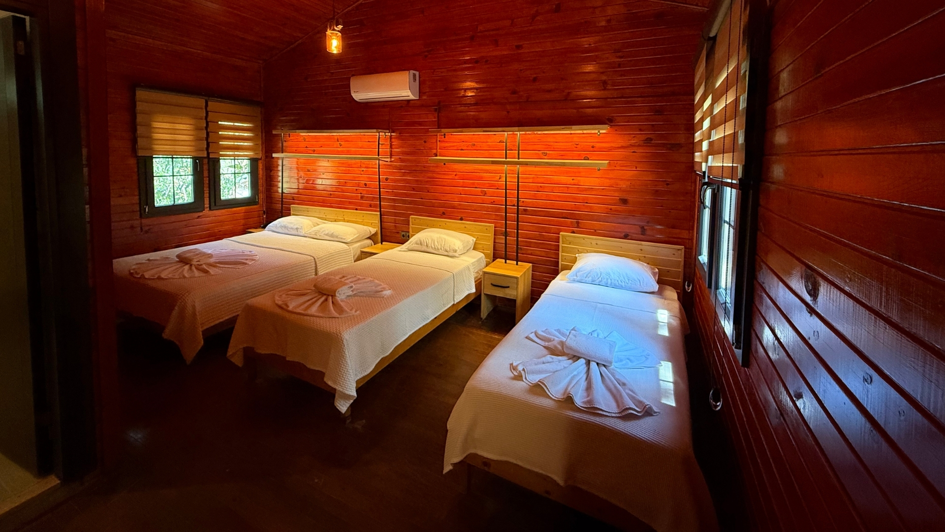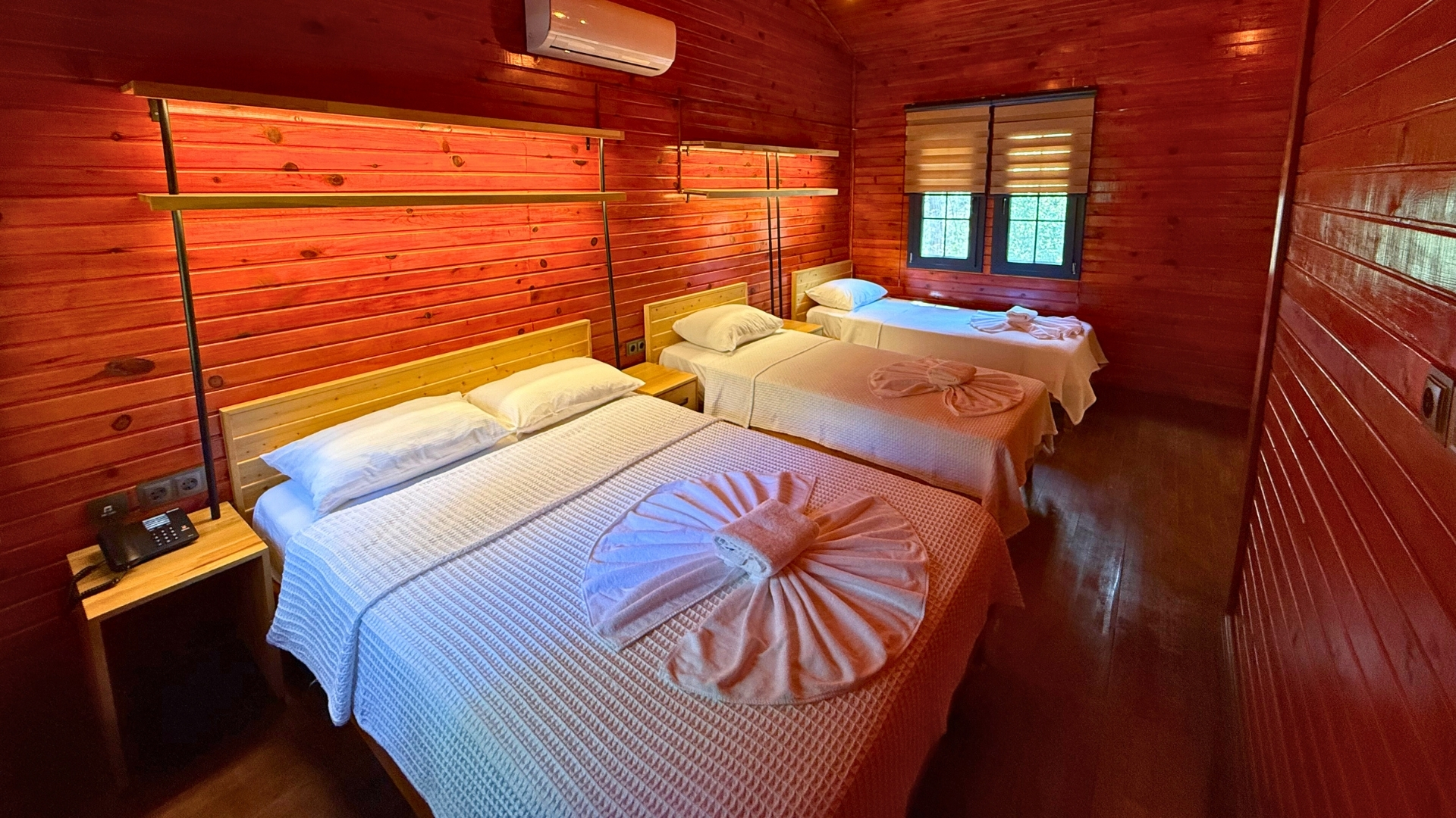28 m² genişliğinde olan, müstakil yapısıyla ailelere özel ferah ve konforlu konaklama imkanı sunan Bungalovlarımız 1 adet çift kişilik yatak ve 2 adet tek kişilik yataktan oluşmaktadır. Tüm ailenizin rahat edeceği bu özel bungalowda, konforunuz için televizyon, klima, mini bar, saç kurutma makinesi, telefon ve Wi-Fi gibi olanaklar mevcuttur. Olympos'taki aile tatiliniz için keyifli anlar biriktirin.